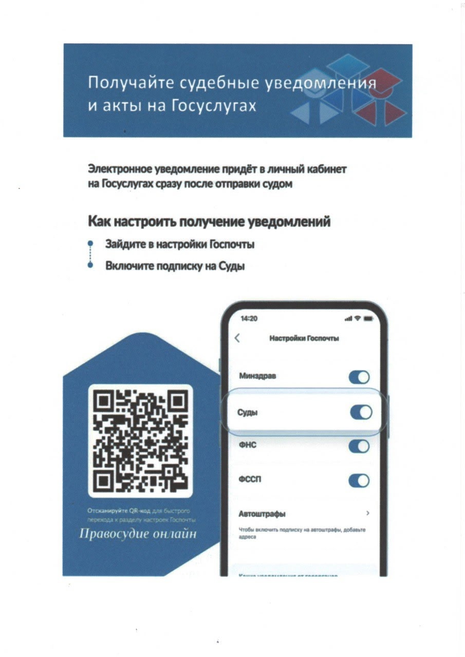 Получайте судебные уведомления и акты на Госуслугах Приказом Судебного департамента при Верховном Суде РФ от 25.07.2025 г. № 118 в Инструкцию по судебному делопроизводству в районном суде, утверждённую приказом Судебного департамента от 29.04.2003 г. № 36 внесены изменения, которыми в целях реализации положений ГПК РФ, КАС РФ, УПК РФ, КоАП РФ предусмотрена возможность направления работниками аппарата суда: ● участникам судопроизводства судебных уведомлений (судебных извещений, копий судебных актов) в электронном виде посредством Единого портала государственных услуг (ЕПГУ) с использованием государственной электронной почтовой системы (ГЭПС); ● Доставка судебных уведомлений (судебных извещений, копий судебных актов) осуществляется в личный кабинет физического лица, индивидуального предпринимателя, юридического лица на портал «Госуслуги» (ЕПГУ) исключительно при наличии согласия адресата на получение судебных уведомлений, выраженного в форме простановки соответствующей отметки в настройках личного кабинета на ЕПГУ. Инструкция по включению согласия на получение судебных уведомлений на Едином портале государственных услуг (доступ с компьютера) 1. Зайти на Портал Госуслуг, перейти в «Меню пользователя» и открыть раздел «Уведомления». 2. Нажать на 3 вертикальные точки и выбрать «Настройки». 3. Перейти в раздел «Госпочта», найти параметр «Суды» и включить получение уведомлений. Инструкция по включению согласия на получение судебных уведомлений на Едином портале государственных услуг (в мобильном приложении Госуслуги) 1. Открыть мобильное приложение и выбрать раздел «Профиль» 2. В разделе «Профиль» открыть вкладку «Настройка Госпочты» 3. Выбрать параметр «Суды» и включить получение уведомлений.